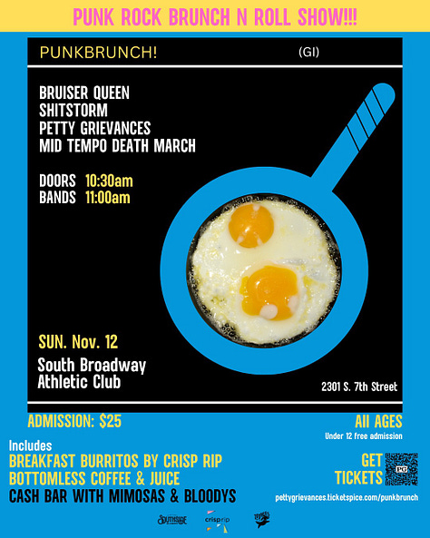 Eberhardt: We’re about to start publicizing our next project: we’re calling it PUNKBRUNCH! It’s Sunday, Nov. 12 at South Broadway Athletic Club. The lineup is Bruiser Queen, Shitstorm, Mid Tempo Death March and us. And our friend Chef Dan Johanning (of the very rockin’ Dissappeared) will be doing up his killer breakfast burritos. Bands, breakfast burritos, Bloody Marys, coffee, juice, full bar. It should be a blast. If it takes off we’ll try to do it again and maybe make it a thing.